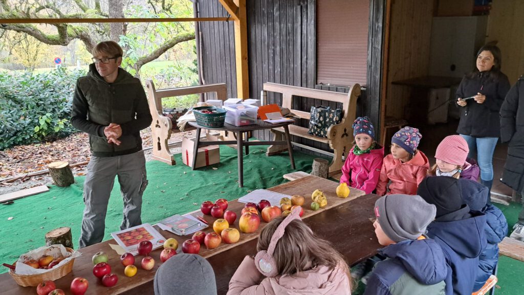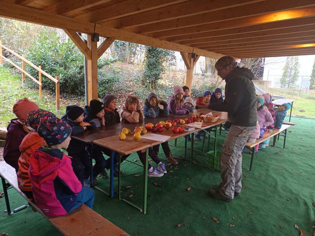 Pomologe Rene brachte zur Novembergruppenstunde gaaanz viele unterschiedliche Äpfel mit – süße, saure, große, kleine, rote, grüne, bunte…. Die Gartenfrüchtchen erfuhren, wie der Apfel aufgebaut ist, was es braucht, um aus der Blüte ein Apfel zu werden und durften die vielen Apfelsorten selbstverständlich aus probieren.